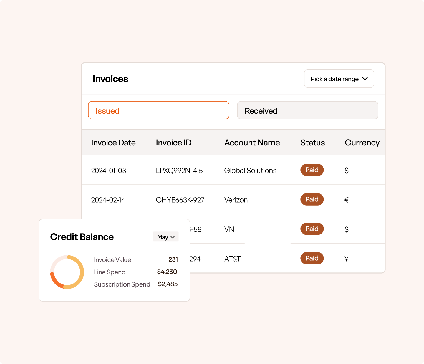 Track ongoing telecom expenses for the current month in real-time, review unpaid invoices for purchases or subscriptions, and ensure you have sufficient credit balances for future transactions.