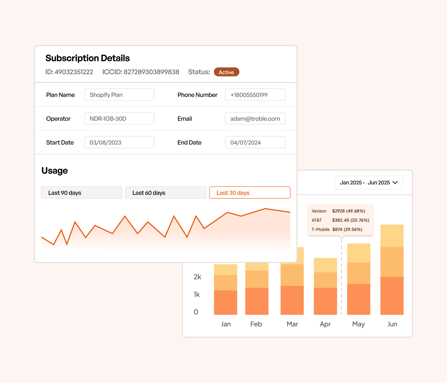 Track data, voice and SMS usage across active subscriptions in any timeframe.  Stay alert to telecom usage fluctuations and take action.