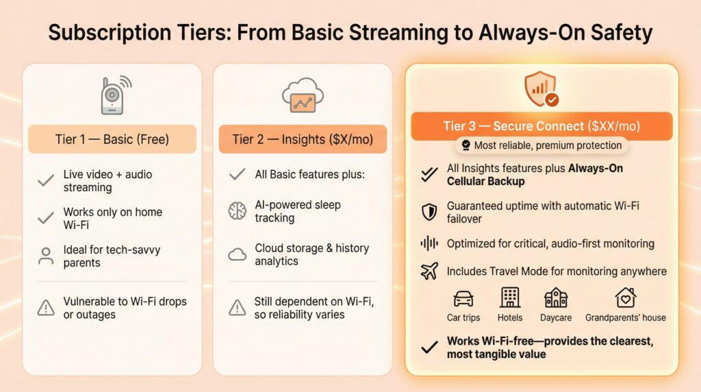 Most premium baby monitor brands still rely on unstable home Wi-Fi while selling “sleep insights” subscriptions on top of that weak foundation. When connectivity drops, so does subscription value. Parents do not blame their router — they blame the monitor.